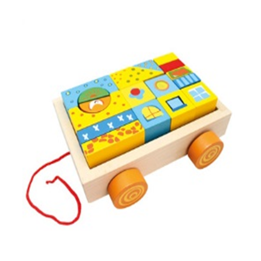 Cărucior de tracțiune cu cuburi din lemn (19 piese)