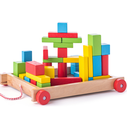 Cărucior de tracțiune cu cuburi din lemn (34 piese)